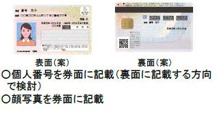 A:個人番号カードは、住民基本台帳カードと同様、ICチップのついたカードで、表面に氏名、住所、生年月日、性別(基本4情報)と顔写真、裏面にマイナンバー(個人番号)が記載されます。本人確認のための身分証明書として使用できるほか、図書館カードや印鑑登録証など自治体等が条例で定めるサービスに利用できます。 一方、通知カードは、紙製のカードを予定しており、券面に氏名、住所、生年月日、性別(基本4情報)、マイナンバーは記載されますが、顔写真は記載されません。なお、通知カード単体では本人確認はできませんので、併せて、主務省令で定める書類(運転免許証等となる予定)の提示が必要となります。